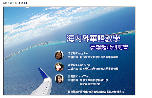 在這個講座,我得到許多實用的資訊,感受到三位華語老師對於教學的熱誠與無私的分享,不僅讓自己對於華語教學有進一步的了解,也讓人體會到積極和努力的重要性,感謝各位老師! - Tina Chiu