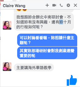 因為我現在是大二的學生,華語教學的課程也是剛接觸,對於很多華語教學的事情還沒有很深入的了解。但是這次的分享會讓我聽到很多資訊與經驗分享,這也算是偶像見面會,從高中就有開始追蹤Claire老師的粉絲專頁,今天能看到老師很開心。也認識到很棒的姐姐。 - 張婷雅