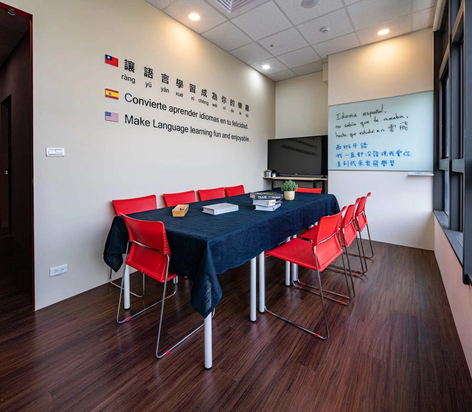 雲飛教室牆上的Slogan:讓語言學習成為你的樂趣 Convierte aprender idiomas en tu felicidad.