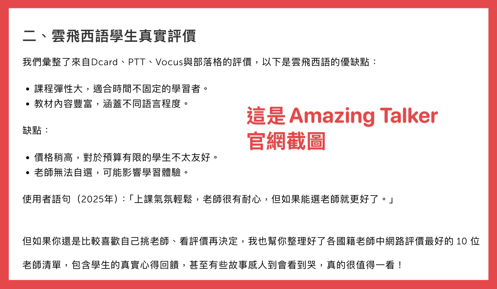 - 三、AmazingTalker官網評價雲飛西語,第二段的錯誤資訊: