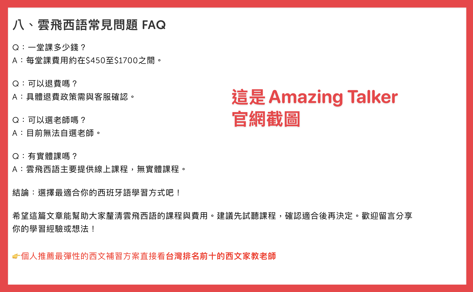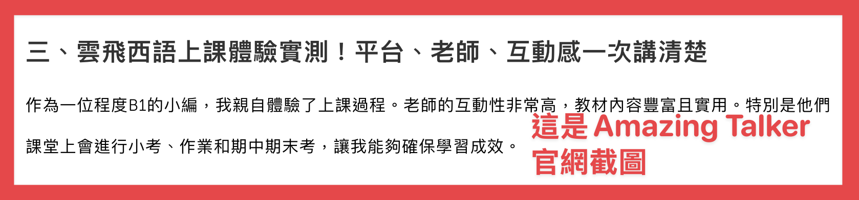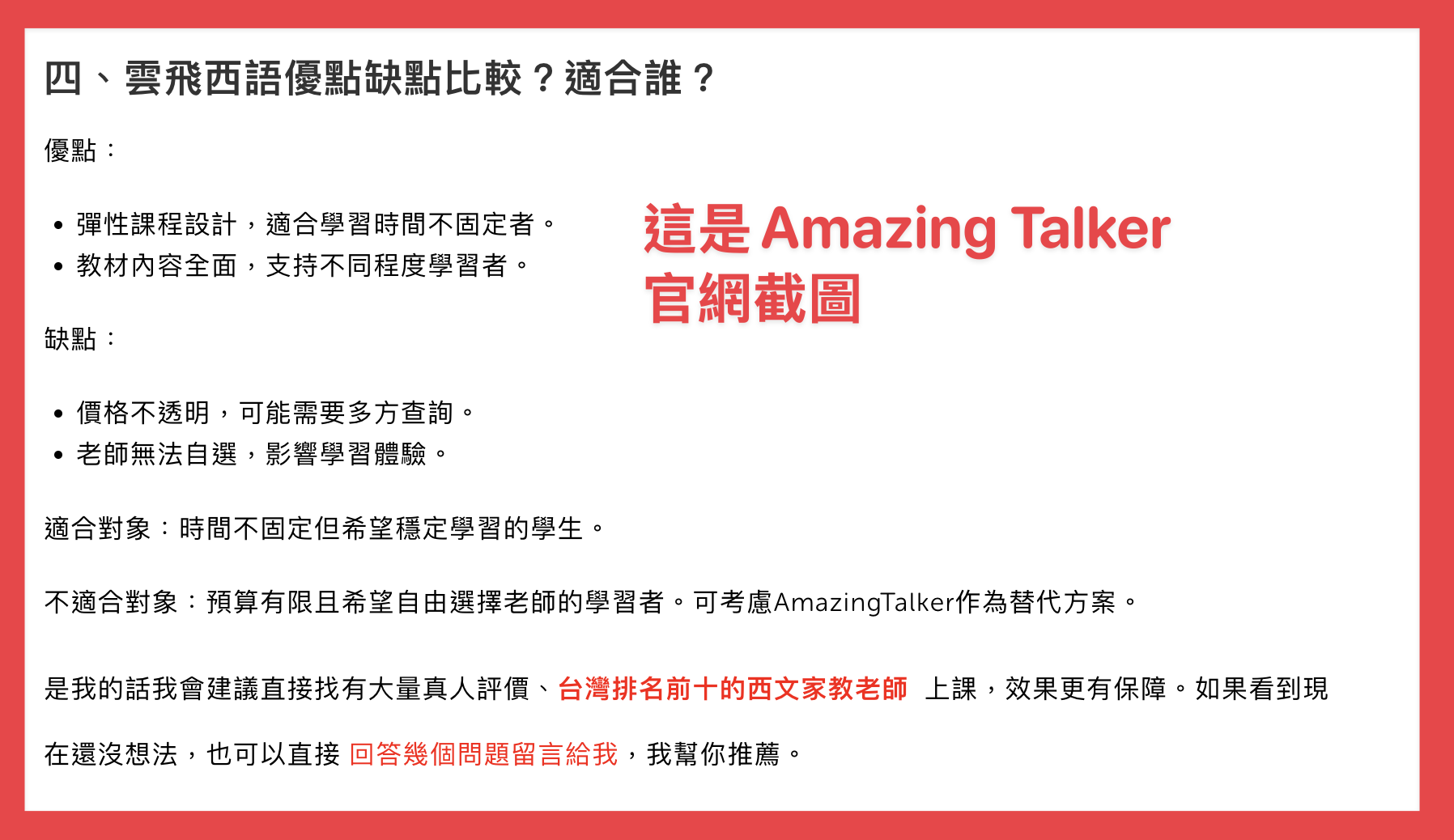- 四:AmazingTalker官網評價雲飛西語,第三段的錯誤資訊: