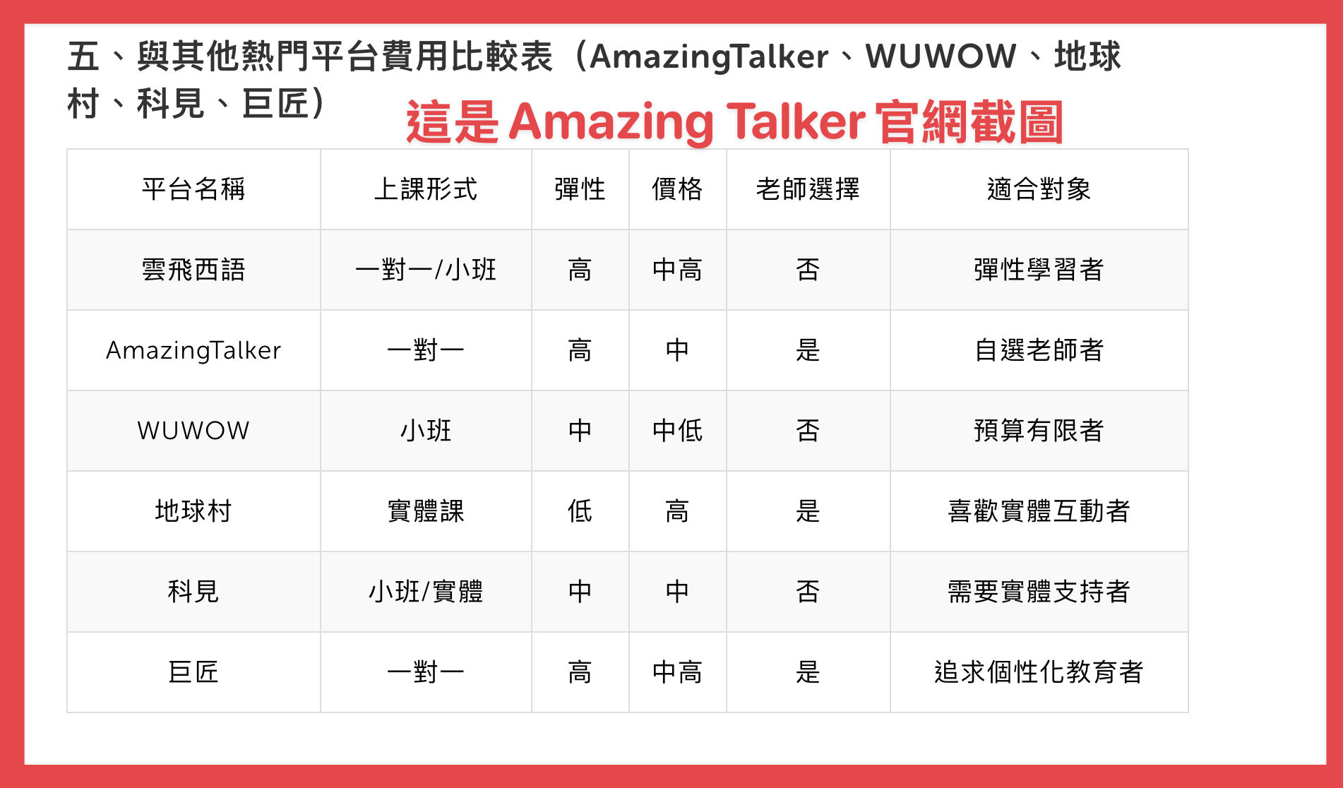 這個表格是Amazing Talker自己整理他們平台各個國籍老師的收費,我是不懂學西文的費用跟老師的國籍之間的關聯,不過這跟雲飛無關就是了,純粹順便提問。