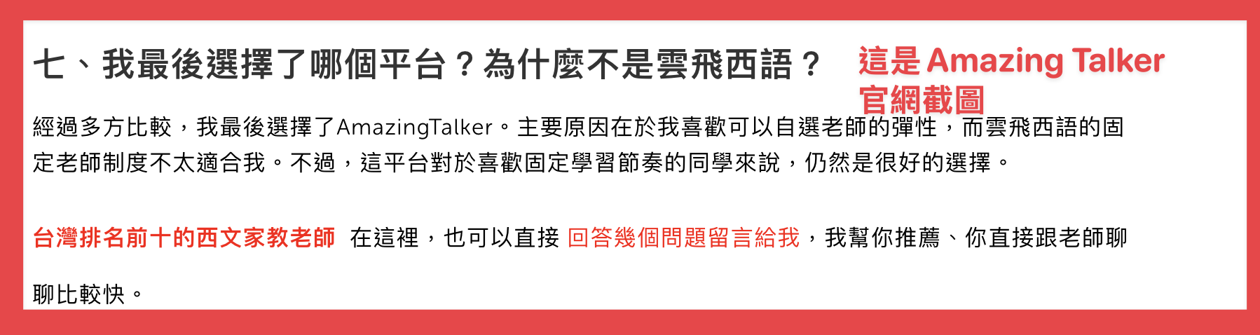 八、AmazingTalker官網評價雲飛西語,第七段的錯誤資訊: